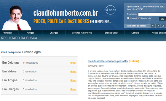 O renomado jornalista Cláudio Humberto divulgou o episódio em seu Blog de repercussão nacional: “O prefeito Luciano Agra (sem partido) demitiu nesta quinta-feira (26) o Secretário de Transparência da Prefeitura de João Pessoa, Alexandre Urquiza, pelo twitter. A mensagem, que deveria ser privada, mas foi postada de forma pública, pede para que Urquiza deixe o cargo antes que seus sucessivos escândalos na mídia local aumentem.”