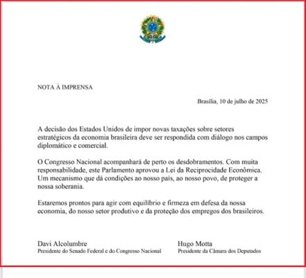 Na nota, Hugo e Davi observam: “O Congresso Nacional acompanhará de perto os desdobramentos. Com muita responsabilidade, este Parlamento aprovou a Lei de Reciprocidade Econômica. Um mecanismo que dá condições ao nosso país, ao nosso povo, de proteger a nossa soberania.”