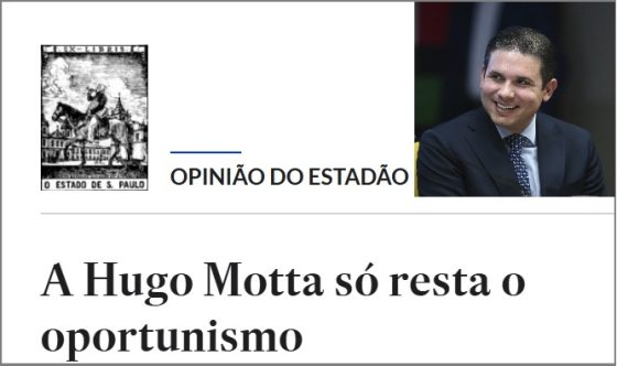 Diz o editorial: “(Hugo Motta) É um deputado aquém do alto cargo que ocupa na República. Sem liderança sobre os pares e a reboque de forças políticas que o excedem em habilidade e influência, o sr. Motta parece querer compensar o amadorismo com gestos claramente oportunistas.”