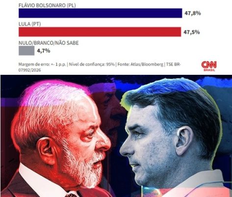 Em uma simulação entre Lula e Flávio, o senador leva vantagem por 0,3 pontos percentuais, com 47,8% das intenções de voto. O petista aparece com 47,5%. Aqueles que votariam em branco, nulo ou não sabem somam 4,7%, traz o portal CNN.