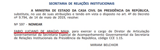 O Diário Oficial da União publicou, na edição de sexta-feira (17/05), a nomeação do paraibano Fábio Luciano de Araújo Maia (Fábio Maia) para o cargo de diretor de Articulação Governamental da Secretaria Especial de Acompanhamento Governamental da Secretaria de Relações Institucionais, que tem como titular a ministra Gleisi Hoffmann. A nomeação foi assinada por Miriam Belchior (Secretária-executiva da Casa Civil).