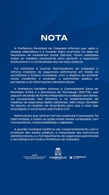 A Prefeitura Municipal de Cabedelo informa que, após o ataque cibernético e a invasão física ocorridos na sede da Secretaria de Assistência Social (Semas), foram adotadas todas as medidas necessárias para garantir a segurança institucional e a continuidade dos serviços públicos.