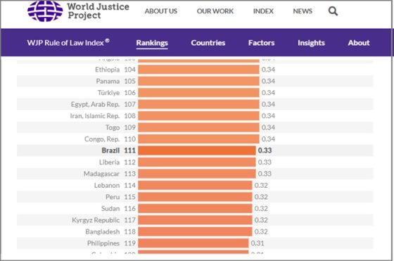 No extremo inferior do ranking vem a Venezuela, com 0,11. O índice da WJP é considerado uma das referências mais robustas sobre o tema, baseado em mais de 215 mil entrevistas domiciliares e 4 mil questionários com especialistas jurídicos em cada país.