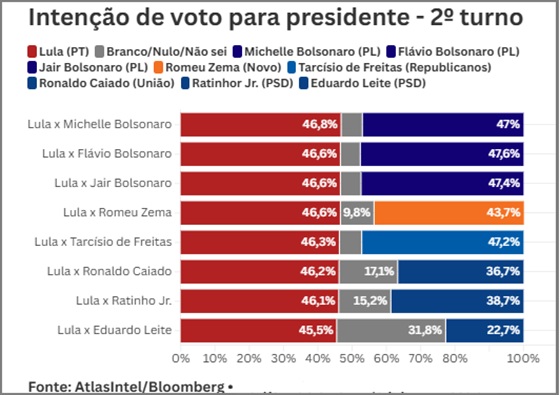 Segundo a pesquisa, divulgada pelo UOL, em um possível cenário de 2º turno entre Lula e Flávio, o senador aparece com 47,6% (era 46,2% na pesquisa anterior) das intenções de votos, enquanto o atual presidente surge com 46,6%. Não sabem ou não responderam, representam 5,8%. É primeira vez que Flávio aparece, pelo menos numericamente, à frente de Lula.