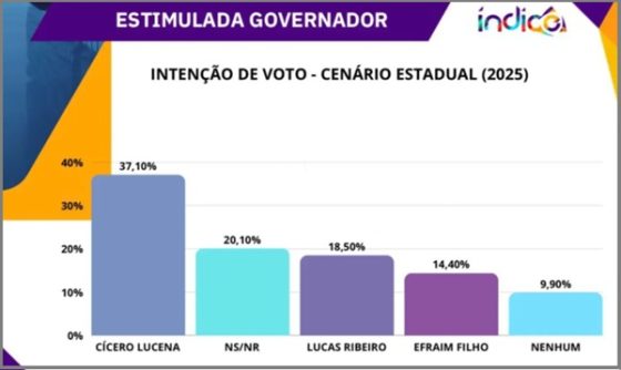 O senador Efraim Filho (UP) viria em terceiro, com 14,4% dos votos. O Estudo também indicou que 20,10% dos eleitores se revelaram indecisos ou não quiseram responder, enquanto 9,90% dos entrevistados optaram por “nenhum” dos candidatos apresentados na pesquisa estimulada.