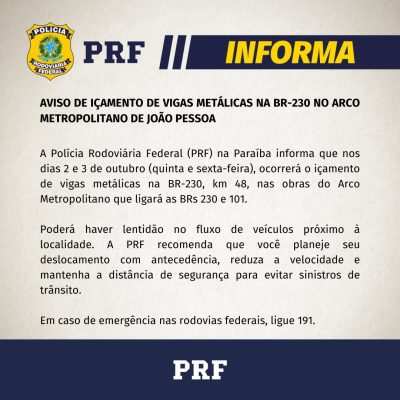 A Polícia Rodoviária Federal da Paraíba (PRF-PB) informou que o trânsito no km 48 da BR-230 poderá registrar lentidão nesta quinta-feira (2) e sexta-feira (3) devido ao içamento de vigas metálicas das obras do Arco Metropolitano de João Pessoa.