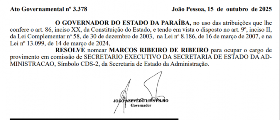 SAIU NO DIÁRIO OFICIAL João Azevêdo nomeia Marcos Ribeiro como secretário executivo de Administração - Helder Moura
