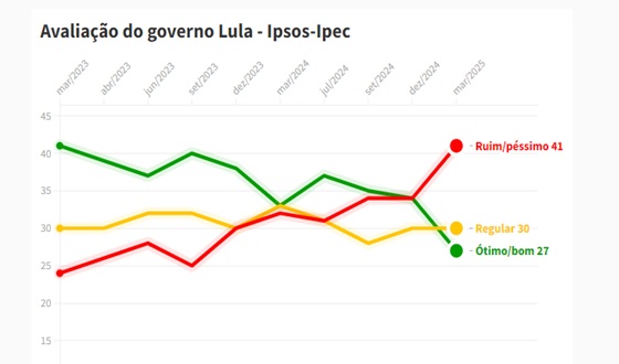 Mais uma pesquisa na praça indica aumento da rejeição ao presidente Lula. Desta vez, o Instituto Ipsos-Ipec traz que a desaprovação ao petista cresceu 7% entre dezembro de 2024 e início de março de 2025.